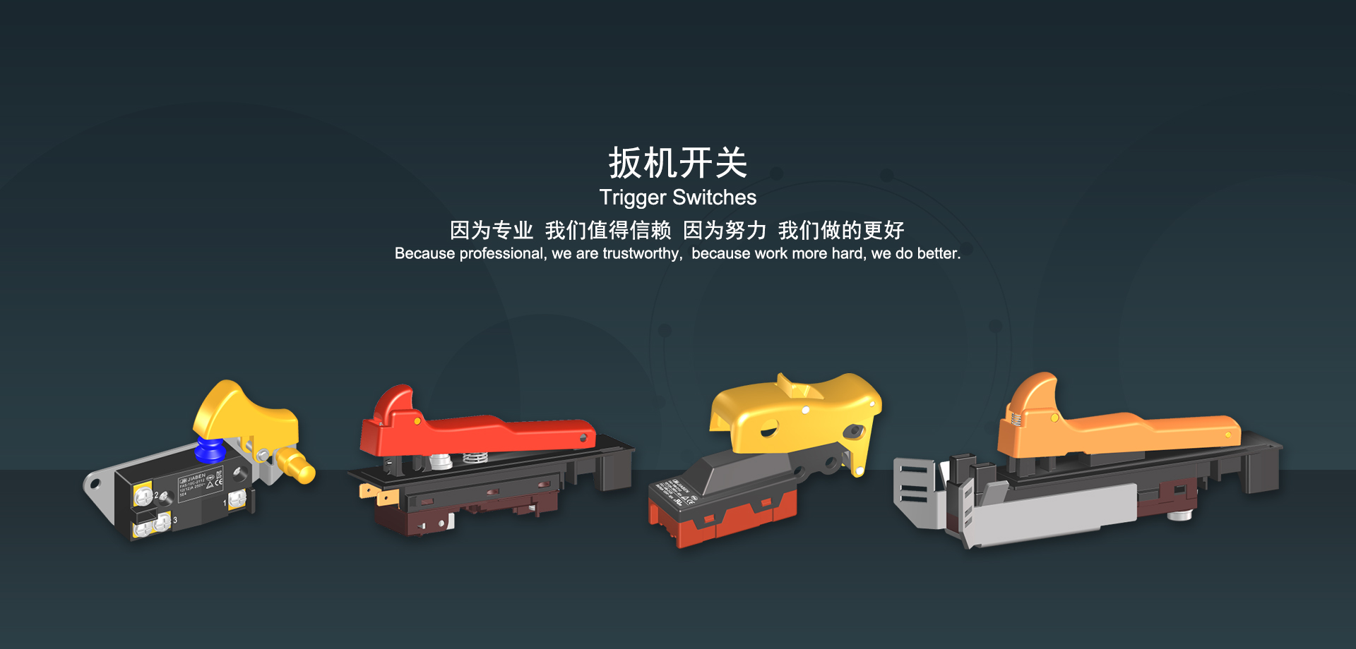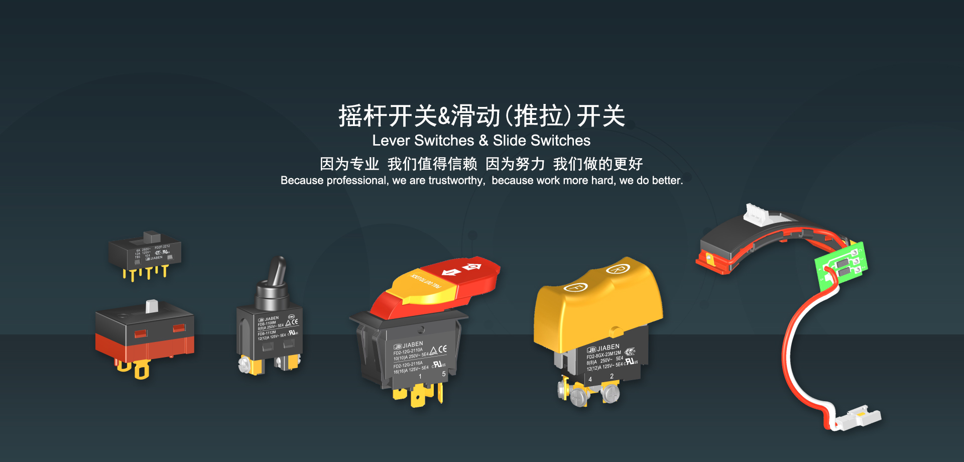 浙江佳奔電子有限公司始建于1986年,坐落于浙江省樂清市虹橋鎮(zhèn)東電子信息產(chǎn)業(yè)園內(nèi),現(xiàn)有職工700多人,資產(chǎn)總額超3億元。公司主要經(jīng)營“JIABEN”牌微動(dòng)開關(guān)、蹺板開關(guān)、按鈕開關(guān)、扳機(jī)開關(guān)、調(diào)速開關(guān)和電位器開關(guān)等各類交、直流器具開關(guān)和各類交、直流線路板模塊等產(chǎn)品,主要應(yīng)用于交、直流電動(dòng)工具、電動(dòng)園林工具、清潔器具、家用電器和小型機(jī)床等行業(yè),是集產(chǎn)品設(shè)計(jì)、研發(fā)、制造、銷售和服務(wù)于一體的國家高新技術(shù)企業(yè)。JIABEN was founded in 1986, located in East Electronic Information Industry Park, Hongqiao Town, Yueqing City, Zhejiang Proviance, existing staff more than 700 peoples, more than 300 million RMB worth of assets. Company is mainly engaged in "JIABEN" brand Micro Switch, Rocker Switch, Push-button Switch, Trigger Switch, Speed Regulating Switch, Potentiometer Switch and other kinds of appliance switch and all kinds of AC or DC circuit board module, such as more than 100 series, 8000 kinds of models of products, mainly used in AC or DC Power-tools, Power Gardening Tools, Cleaning Appliances, Household Appliances and Small Machine Tool and other industries, is the collection product design, research and development, manufacturing, sales and service in one of the national high and new technology enterprise.
